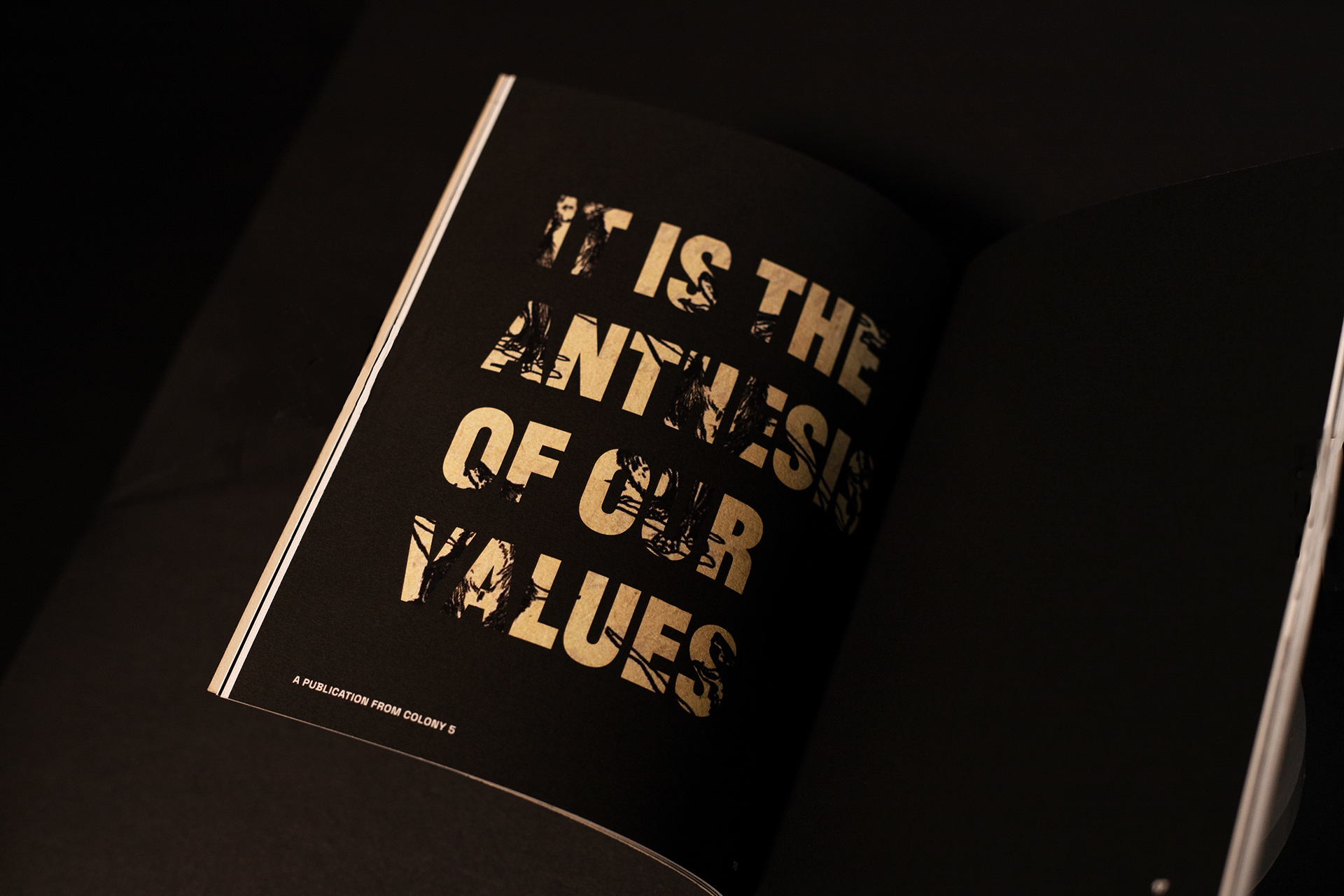 This manifesto for a fictional spaceship called ‘Colony 5’ takes place hundreds of years into the future. It details histories of planet earth to shed light on the spaceship inhabitants and why they live in a collectivist way. Further, this manifesto poked holes at the values of the 21st century such as individualism, consumerism and lack of care toward the sustainability of the planet. I implemented and communicated these values using directive language. It is a retelling of history shown in a certain light, curated and suited to the Colony's mission to relay their mentality as thinly veiled propaganda.